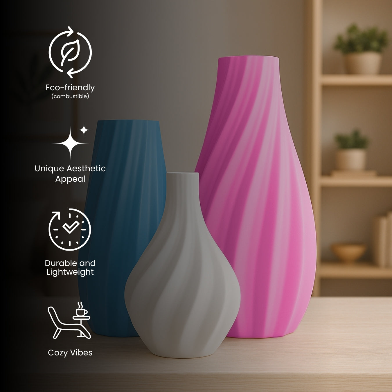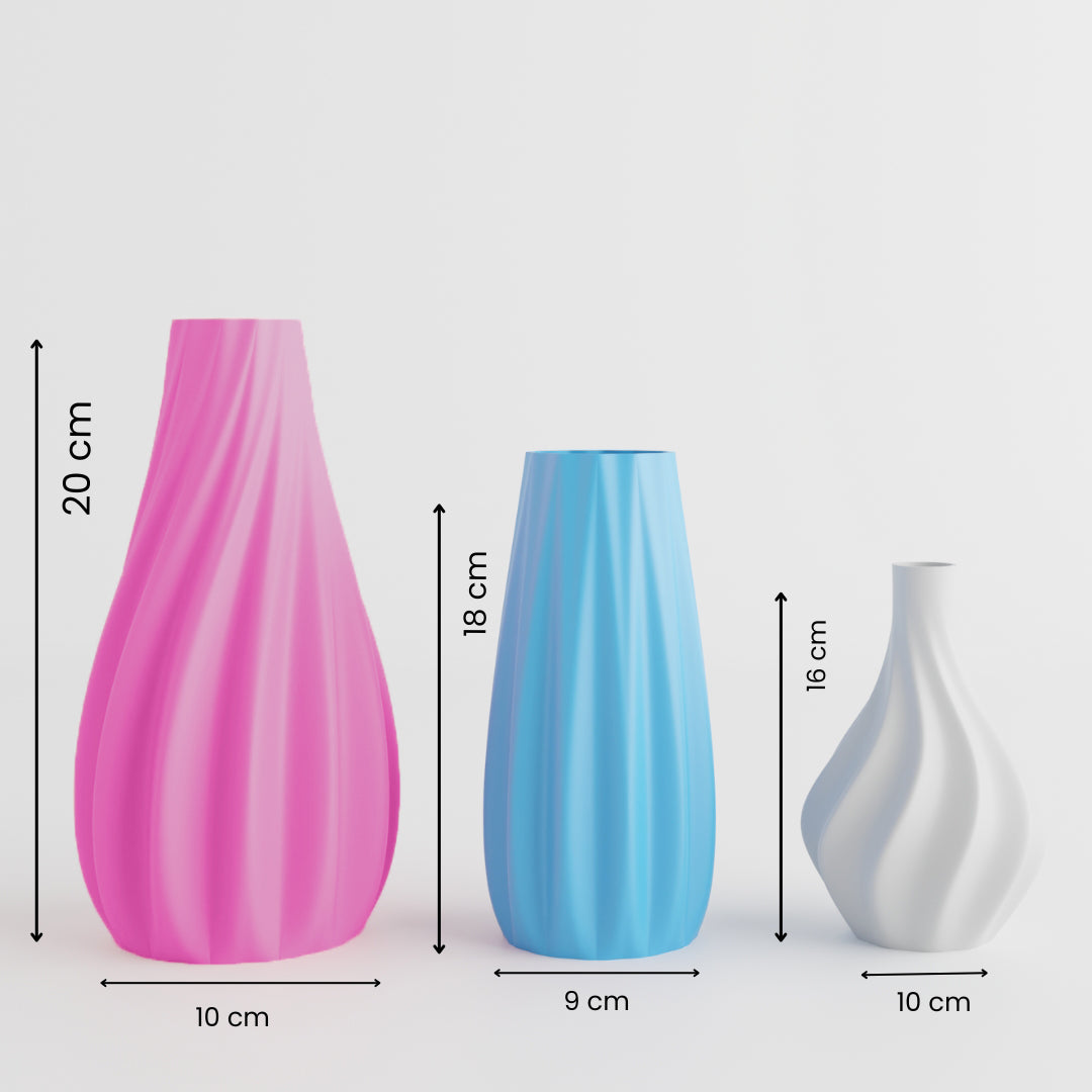 - Texture: Each vase brings a different tactile and visual experience, from minimalistic grooves to dramatic spirals — offering variety in one combo.